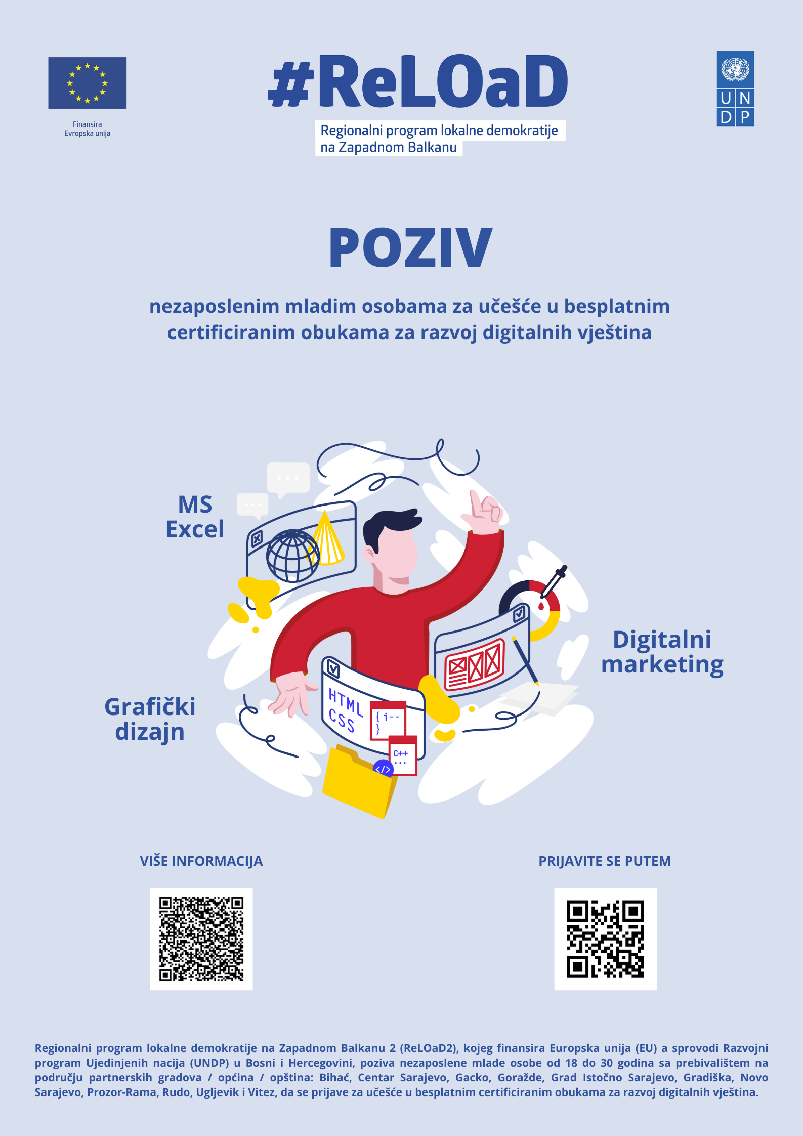 Regionalni program lokalne demokratije na Zapadnom Balkanu 2 (ReLOaD2) kojeg finansira Europska unija (EU) a sprovodi Razvojni program Ujedinjenih nacija (UNDP) u Bosni i Hercegovini, poziva nezaposlene mlade osobe od 18 do 30 godina sa prebivalištem na području partnerskih gradova / općina / opština: Bihać, Centar Sarajevo, Gacko, Goražde, Grad Istočno Sarajevo, Gradiška, Mostar, Novo Sarajevo, Prijedor, Prozor-Rama, Rudo, Ugljevik i Vitez, da se prijave za učešće u besplatnim certificiranim obukama za razvoj digitalnih vještina.