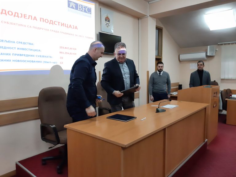 Данас је у просторијама Града Градишка градоначелник Зоран Аџић потписао Уговоре са изабраним подносиоцима пријава на Јавни позив за додјелу подстицаја у оквиру Програма подршке предузетништву за ову годину.