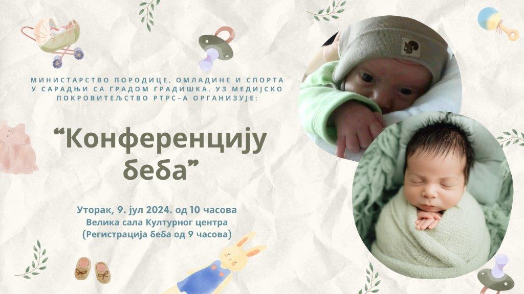 Министарство породице, омладине и спорта у сарадњи са Градом Градишка, уз медијско покровитељство „Радио телевизије Градишка“ организује „Конференцију беба“, 09.07.2024. године у „Културном центру“ Градишка (Велика сала) са почетком у 10.00 часова.