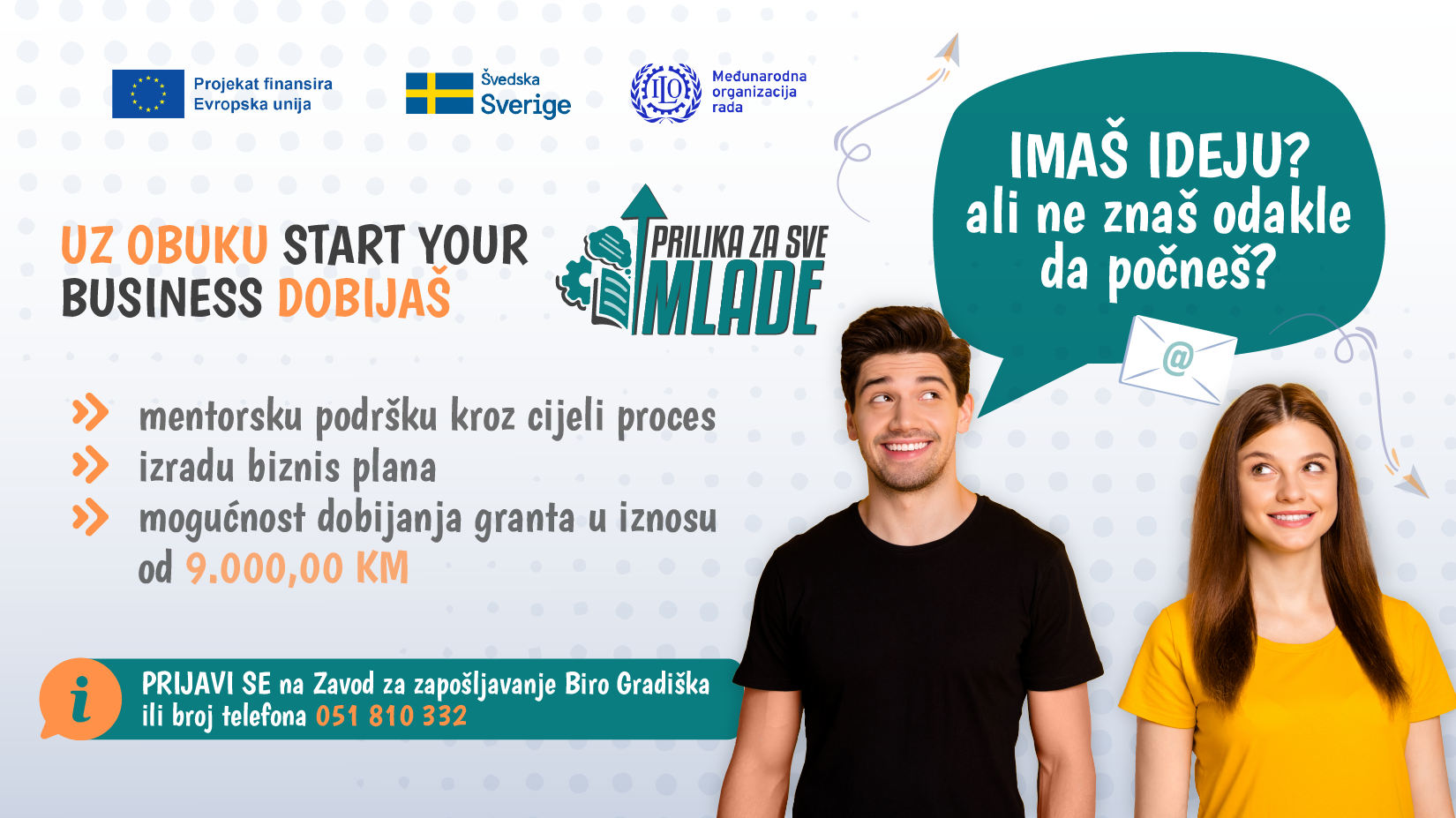 Projekat “Prilika za sve mlade” predstavlja nevjerojatnu priliku za sve mlade ljude s preduzetničkim ambicijama. Bez obzira na to želite li otvoriti restoran, IT start-up, raditi u umjetnosti ili trgovini, ovaj program pruža ne samo finansijsku pomoć, već i potrebne alate za uspješan početak vašeg poslovnog puta.